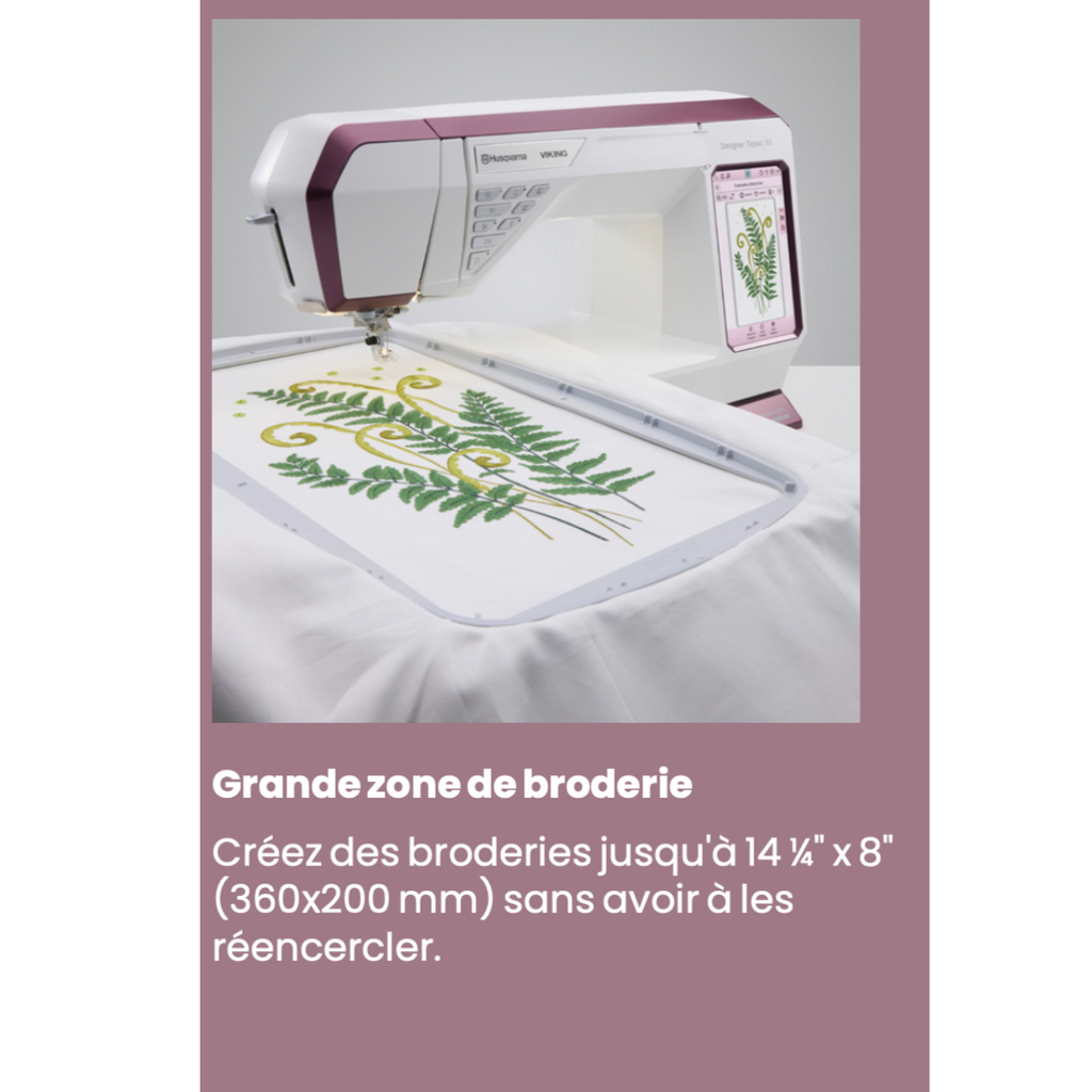 + Grande aire de broderie jusqu'à 14 1/4" x 8" (360MM x 200MM)