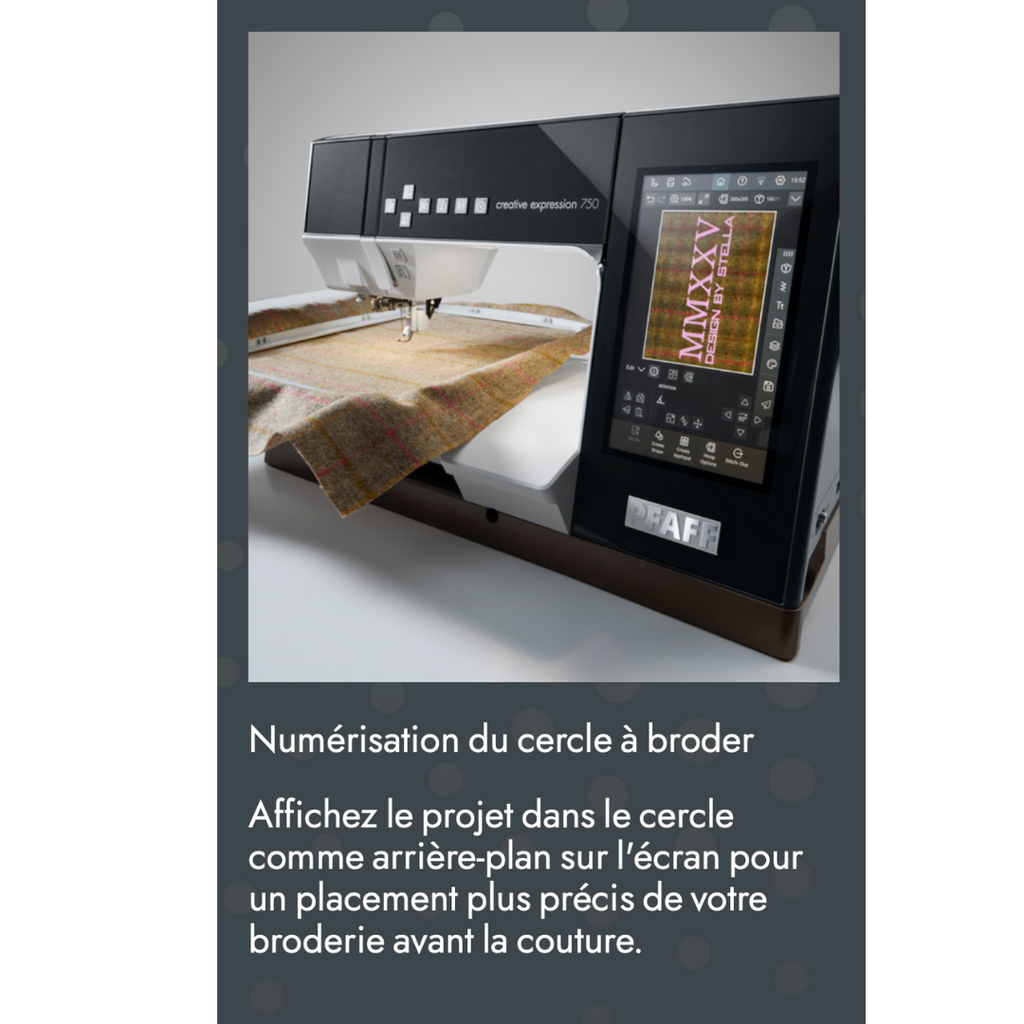 Pour ceux qui veulent tout, la machine à coudre et à broder PFAFF® creative expression750 offre de puissantes capacités de broderie, une grande zone de broderie, la numérisation du cercle et latechnologie ActivStitch.