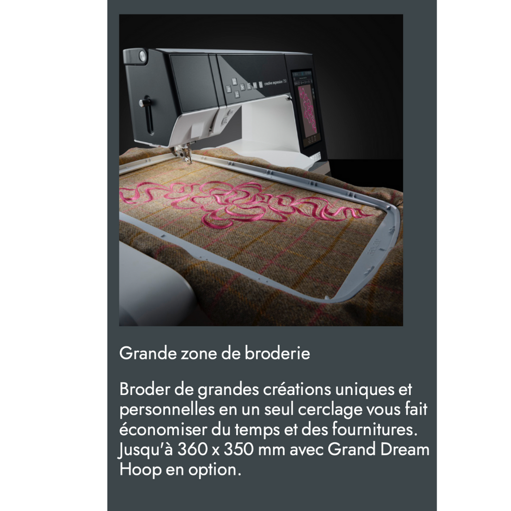 Brodez de grands projets jusqu'à 14,2" x 13,75" (360 x 350 mm) en un seul cerclage. ( Nécessite le Grand Dream Hoop en option.)
